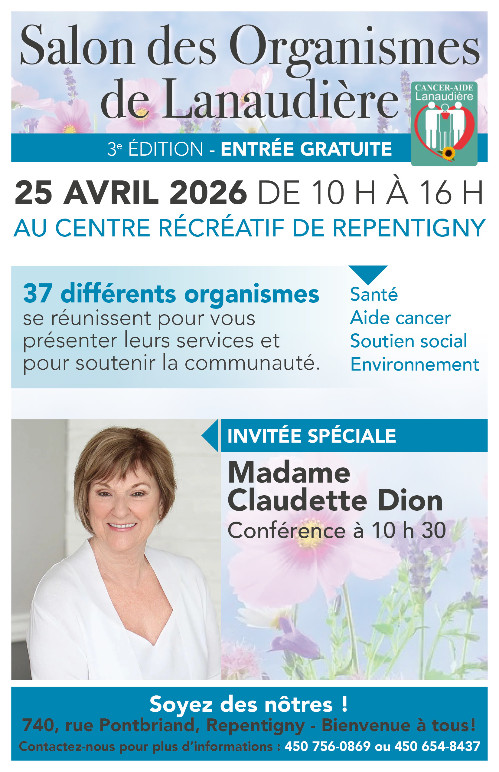 Organisez par l’organisme « Cancer Aide Lanaudière », dès 10h30, ce samedi 25 avril 2026, Madame Claudette Dion vous donnera une conférence venant du cœur tout en partageant sa riche expérience dans les services offerts à la population du grand Lanaudière. Vous sortirez de cette rencontre avec beaucoup d’informations tangibles afin de combler vos besoins ou ceux de votre entourage!